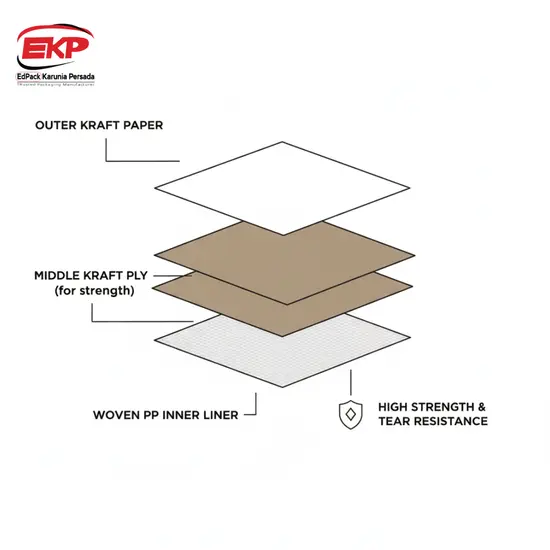 Dirancang dengan konstruksi berlapis yang mengombinasikan kekuatan material woven polypropylene (PP) dan lapisan kertas berkualitas.